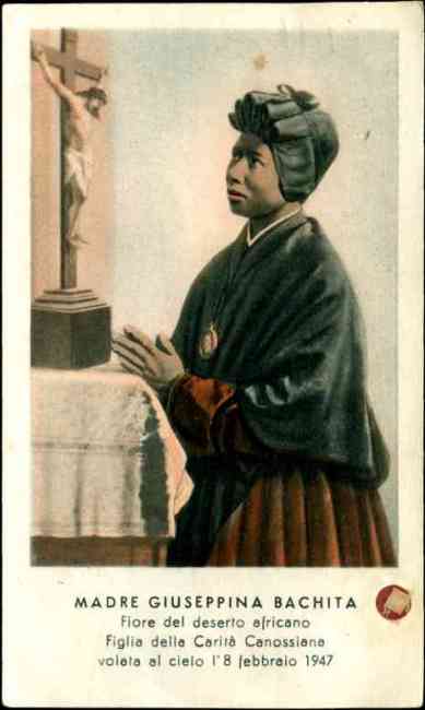 Vie religieuse: Désormais affranchie, Joséphine Bakhita est baptisée le 9 janvier 1890 par le cardinal-archevêque de Venise, Mgr Domenico Agostini. Elle reçoit la confirmation et prend le nom de Joséphine. Pour la première fois depuis son enlèvement, elle fait ses propres choix. En 1893, elle entre au noviciat de l'Institut des catéchistes de Venise. Trois ans plus tard, en 1896, elle prononce ses premiers vœux à Vérone. La traversée de deux conflits mondiaux Joséphine Bakhita est transférée en 1902 à Schio, dans la région de la Vénétie, où elle réside jusqu'à la fin de sa vie. Lorsque la Première Guerre mondiale éclate, la maison des sœurs est utilisée comme hôpital militaire et la canossienne se dévoue entièrement à ceux qui en franchissent le pas. Elle poursuit son engagement spirituel en prononçant ses vœux perpétuels en 1927. Si au couvent elle est chargée essentiellement de la cuisine, elle part en mission à travers l'Italie pour répandre l'évangile et faire connaître son histoire. Les sœurs la lui feront raconter dans un ouvrage intitulé Histoire merveilleuse.Très aimée par la population locale pour son humilité, sa simplicité et son sourire, elle est affectueusement surnommée la «Petite mère noire». Lors de la Seconde Guerre mondiale, la ville de Schio subit plusieurs bombardements, mais n'est pas touchée. La population attribue cette protection à Joséphine Bakhita dont la réputation de sainteté va s'accroître.